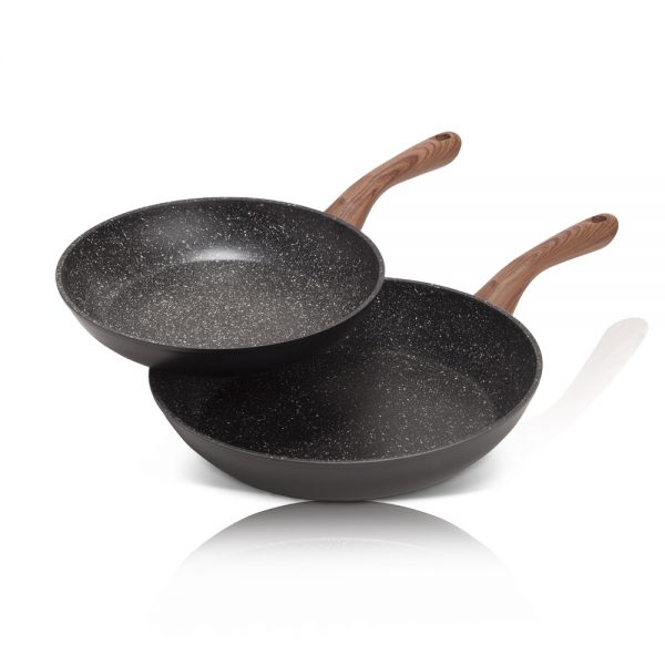 טפלון- סט מחבתות מקצועי למטבח אבן שיש 24 ו-28 עם ידית סיליקון בצביעת עץ