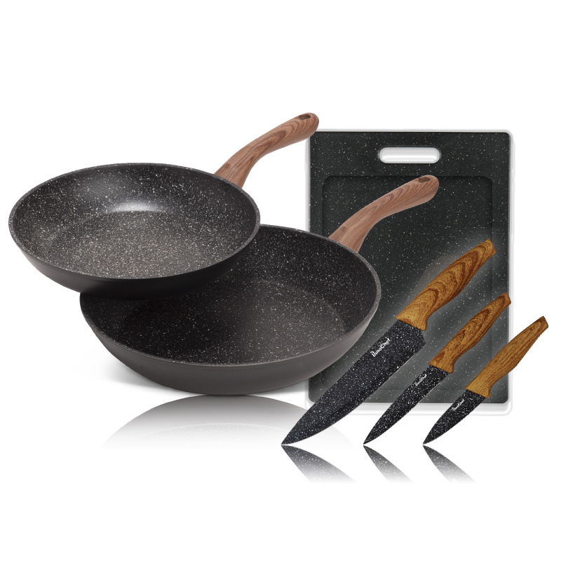 סופר פוד – סט בישול הכולל: סט קרש חיתוך עם 3 סכינים 'בוצ'ר' וסט 2 מחבתות 24 ו-28 עם ידית עץ 'טפלון'