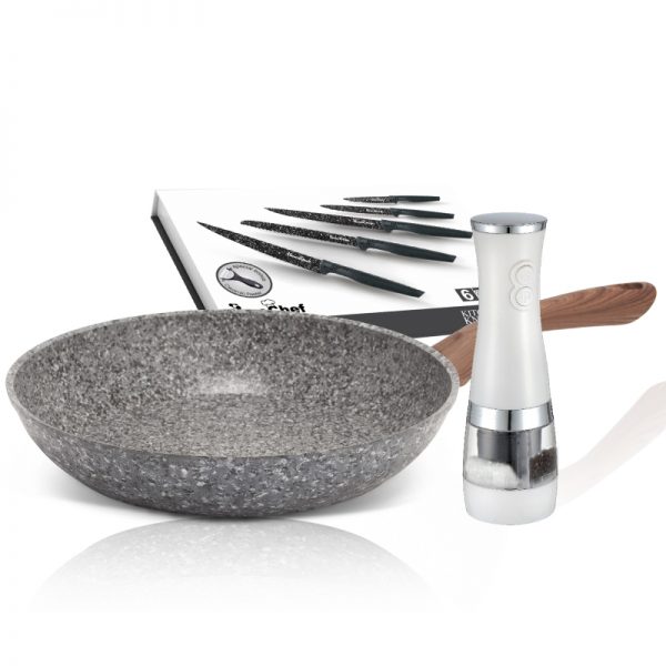 פרפקט – סט בישול הכולל: סט 5 סכינים 'שף', מחבת אבן גרניט 'גראנד' ומטחנת מלח ופלפל חשמלית 'גריינד'